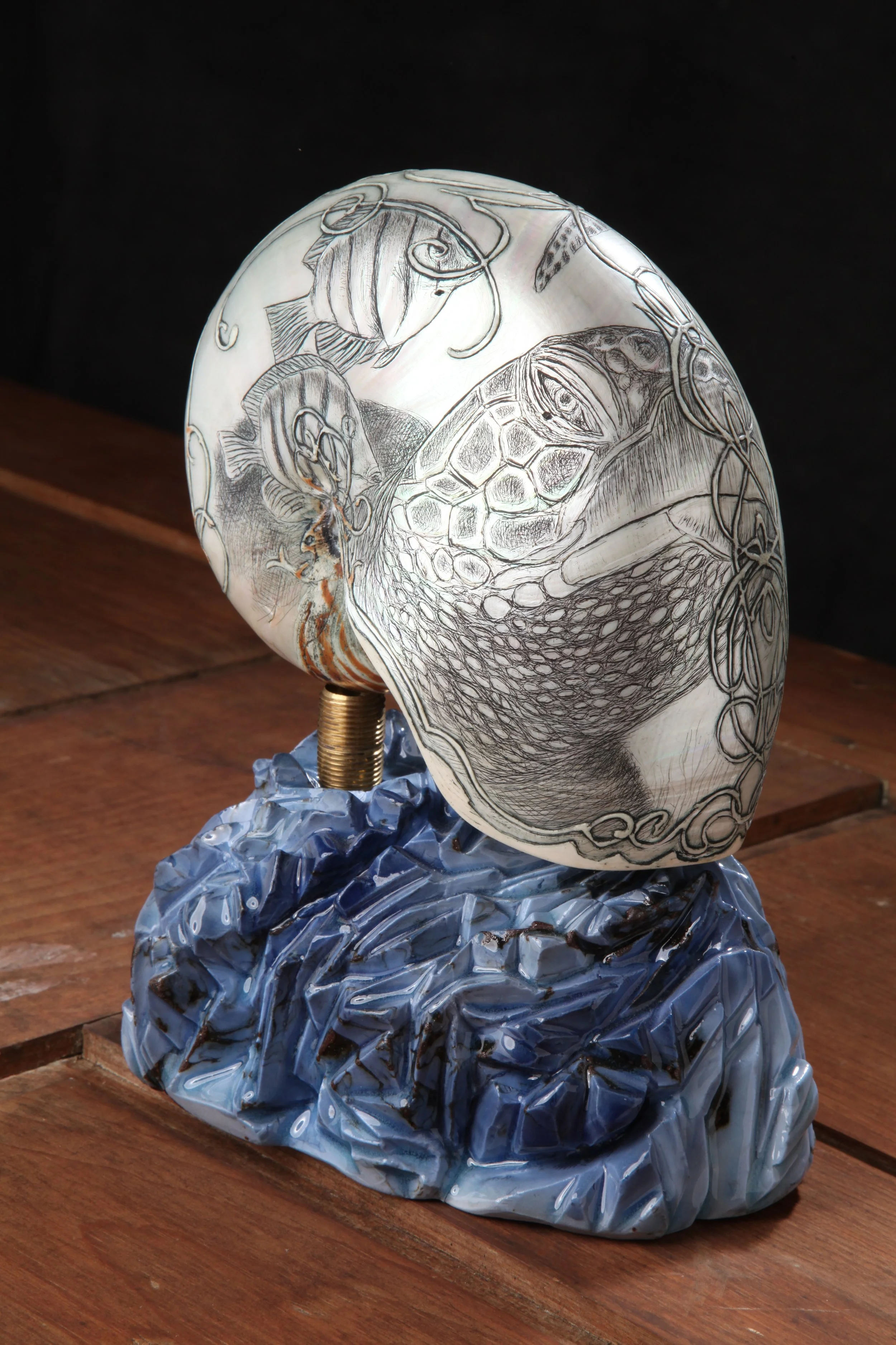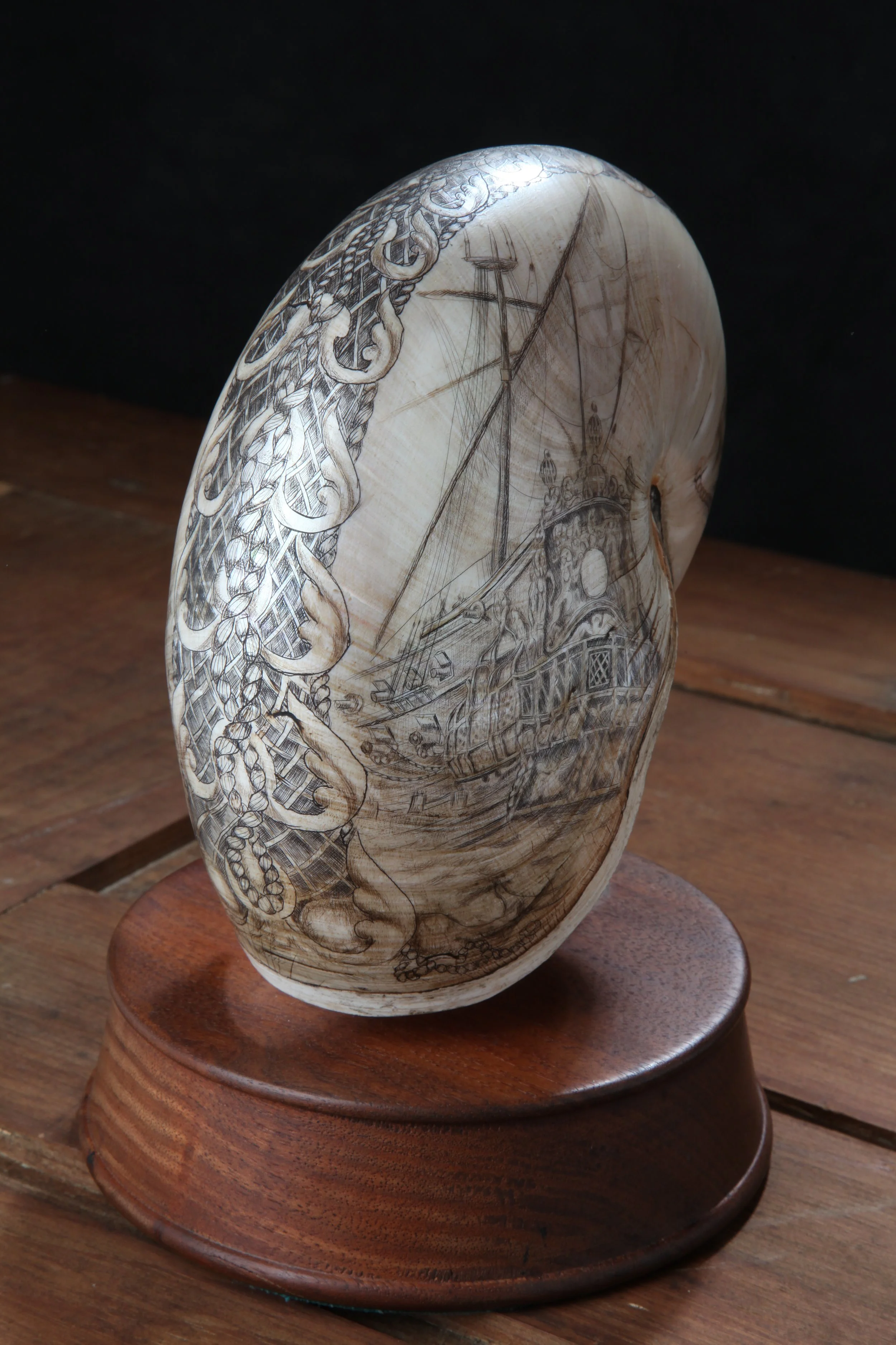 To this end, what is offered is a collection of ten carved and scrimshandered chambered nautilus shells, given by “Scrimshander Down East” as shown on this site. These pieces can not and will not be sold. It is offered one piece at a time, or the whole collection at once for the sole purpose of incentivizing corporate giving to 501c3 non profits as described above. Interested corporations or foundations should please contact us via email.
